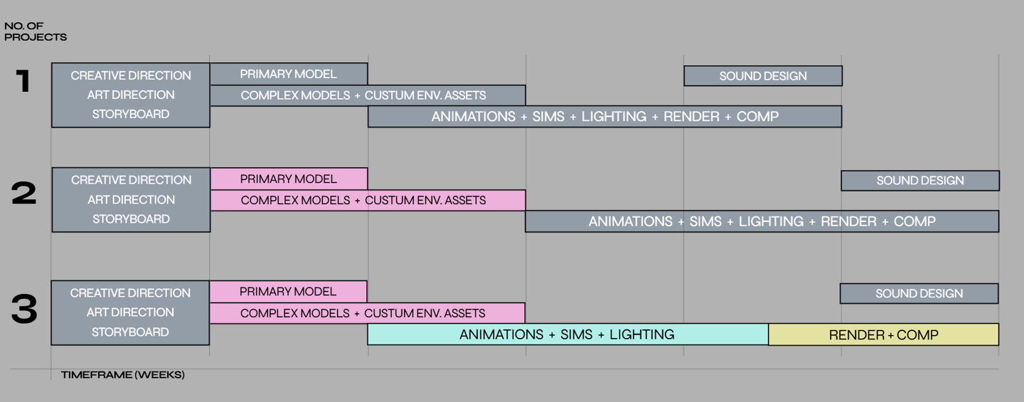 3D Modeling, Rigging, Environment Assets and Scene assembly takes between 1-4 weeks time, that is roughly 25-50% of the whole production timeline.
